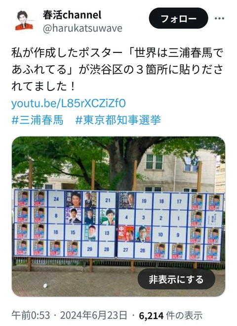 都知事選の掲示板に三浦春馬の選挙ポスター 三浦春馬陰謀論者か アミューズが選管に抗議「強い憤り」 Twitter Facebook はてブ LINE コピー 2024.06.28 スポンサーリンク 1:名無しさん@涙目です。(愛媛県) [US]:2024/06/28(金) 17:09:26.56 ID:5kF2WUCd0 BE:135853815-PLT(13000) アミューズ 三浦春馬さん肖像使った都知事選ポスターに声明 選管に抗議「強い憤り、ご遺族も心痛め…」 https://news.yahoo.co.jp/articles/ce13f53026aa2d722dbd028575db98f1bf063713 2:名無しさん@涙目です。(愛媛県) [US]:2024/06/28(金) 17:11:13.00 ID:5kF2WUCd0 続きを読む