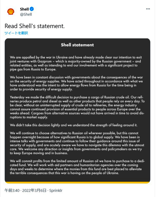 英石油大手シェルは5日、ロシア産原油の購入を続けたことについて「釈明」する声明を出した。前日に欧州報道で発覚し、ウクライナの外相がツイッターでシェルを名指しし、「ロシアの原油にウクライナの血の匂いを感じないのか」などと批判していた。