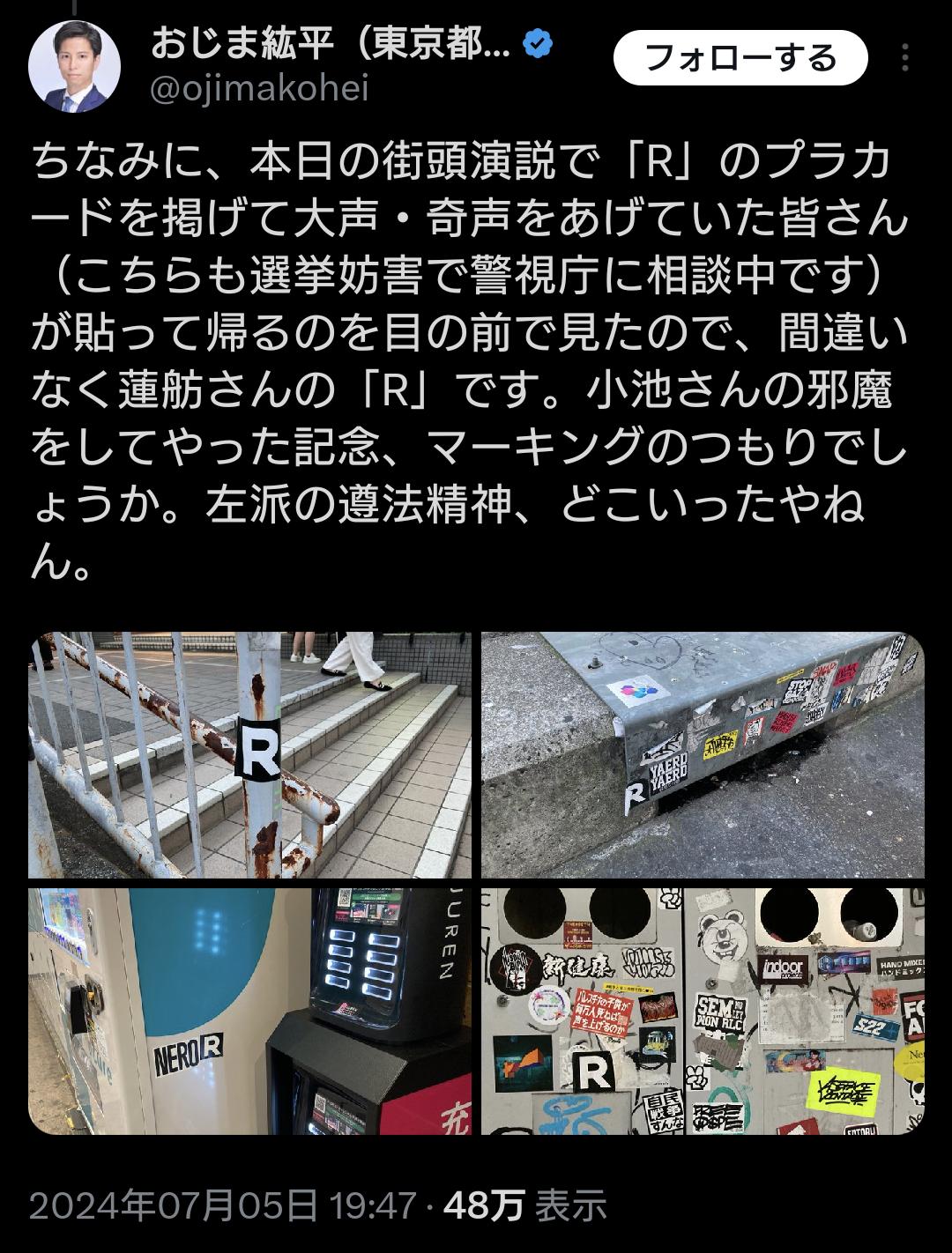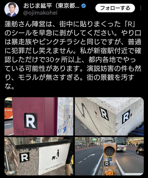 東京、街中が「R」で染まるwwwww (※画像あり) Twitter Facebook はてブ LINE コピー 2024.07.07 スポンサーリンク 1:それでも動く名無し 警備員[Lv.6][新芽]:2024/07/07(日) 10:47:34.41 ID:ytGcc0aHd0707 2:それでも動く名無し 警備員[Lv.18]:2024/07/07(日) 10:48:40.12 ID:TgXM71uR00707 信者のふりしたアンチと思わせたおろかな信者 続きを読む