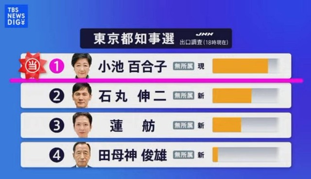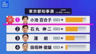 こちらはフジテレビの出口調査の結果です。現職の小池さんは4割を伺う勢いで早々と3期目の当選を決めました。