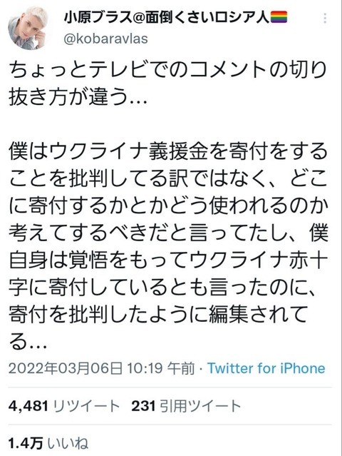 【画像】ロシア人『サンジャポにウクライナへの寄付を批判したように編集された』 Twitter Facebook はてブ LINE コピー 2022.03.07 スポンサーリンク 1:風吹けば名無し:2022/03/06(日) 22:37:06.24 ID:ufGdOmH50.net あかんやろw 4:風吹けば名無し:2022/03/06(日) 22:37:59.49 ID:jLCDXekr0.net サンジャポならしゃあない 5:風吹けば名無し:2022/03/06(日) 22:38:00.39 ID:IStH3b7fM.net サンジャポやぞ 続きを読む