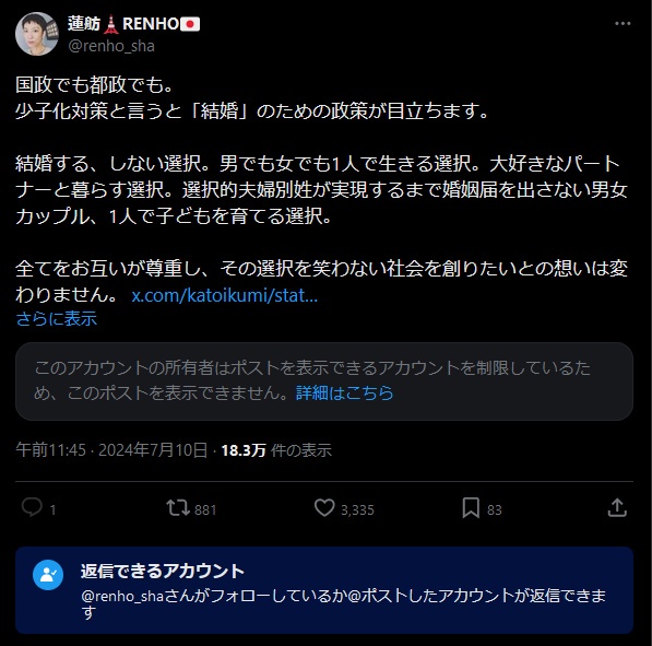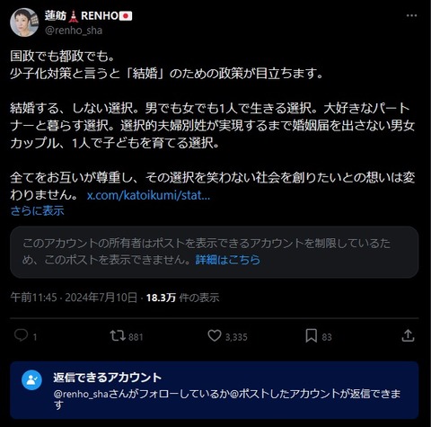 蓮舫がフォローしている人間以外はリプできないよう設定を変更。