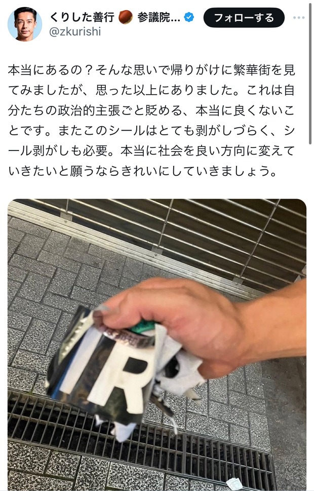 本当にあるの?そんな思いで帰りがけに繁華街を見てみましたが、思った以上にありました。これは自分たちの政治的主張ごと貶める、本当に良くないことです。またこのシールはとても剥がしづらく、シール剥がしも必要。本当に社会を良い方向に変えていきたいと願うならきれいにしていきましょう。 pic.twitter.com/hIHXks9FlG