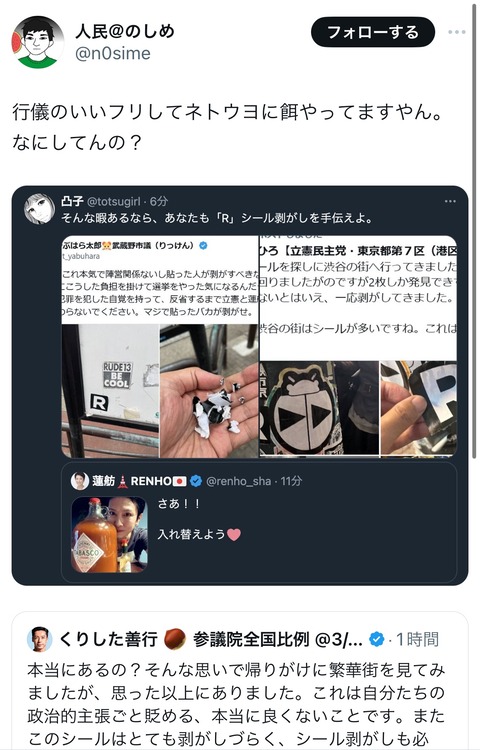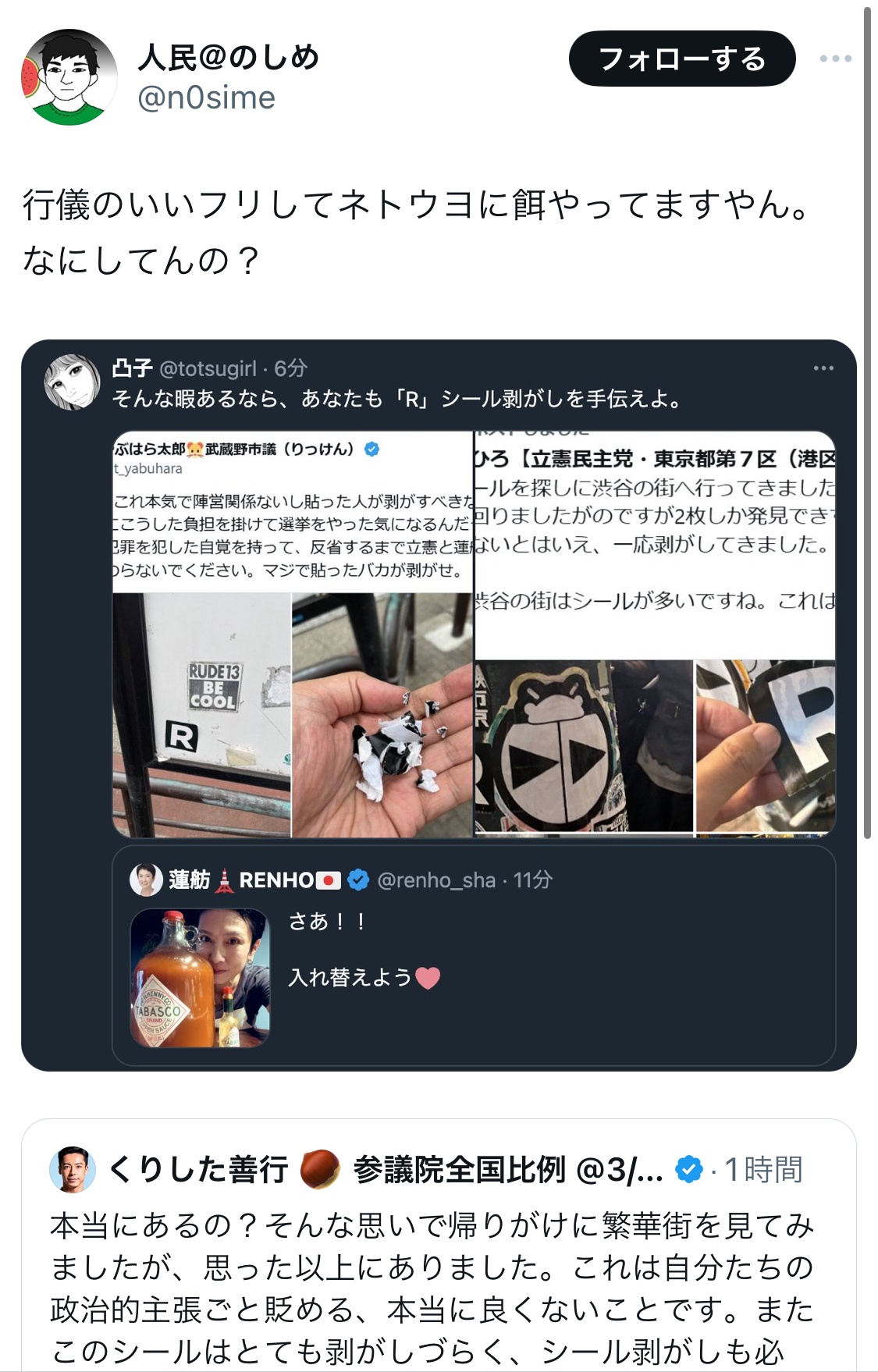 剥がした立憲議員が蓮舫支持者から攻撃されてる模様