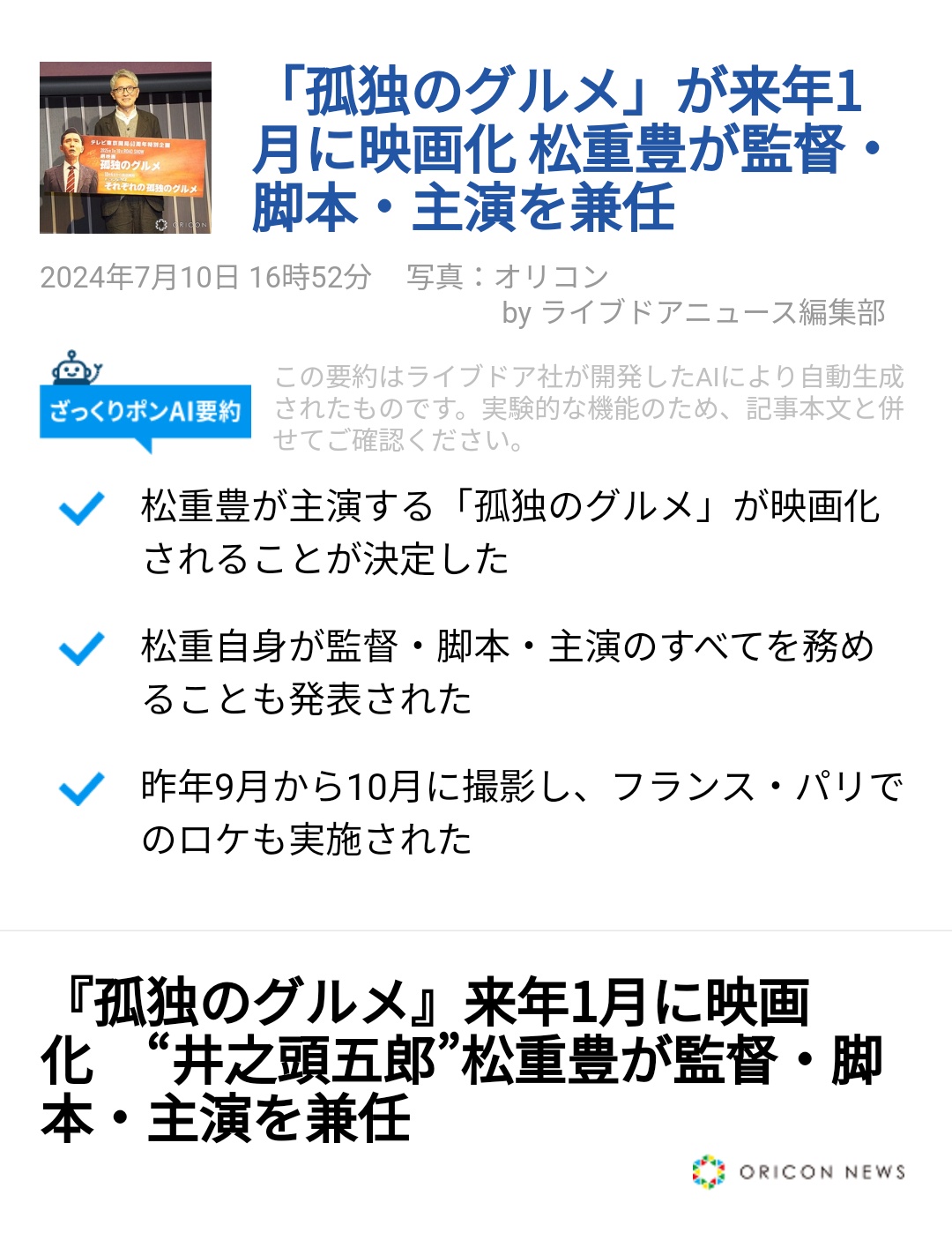 【発表】『孤独のグルメ』来年1月に映画化、松重豊が監督・脚本・主演を兼任https://t.co/yIdLv8Fu5L
