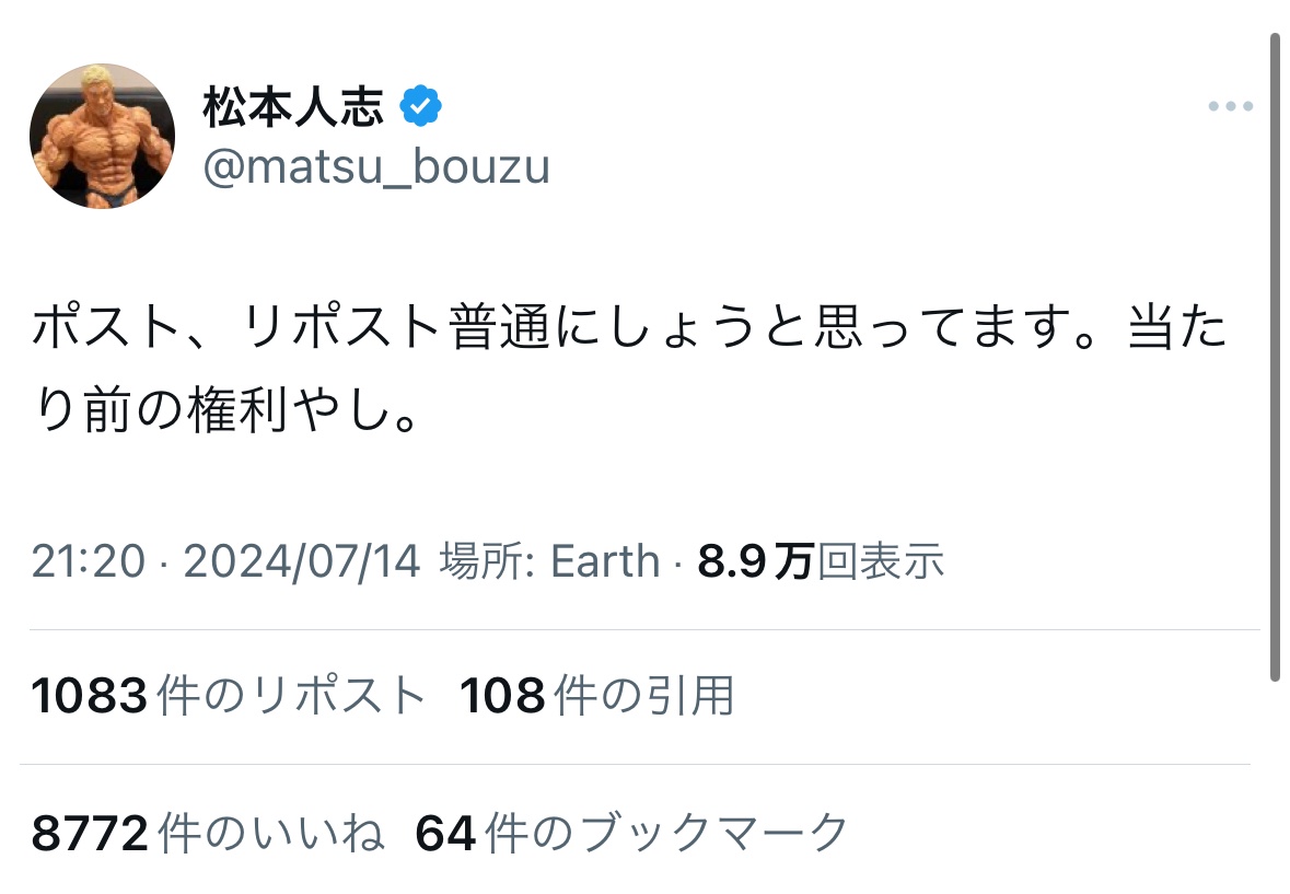 松本人志、X更新「ポスト、リポスト普通にしょうと思ってます。当たり前の権利やし。」 Twitter Facebook はてブ LINE コピー 2024.07.14 スポンサーリンク ◇ 1: 名無しさん 2024/07/14(日) 21:21:02.141 ID:u8ad4WfLH きたきた ◇ 6: 名無しさん 2024/07/14(日) 21:23:14.306 ID:MDlODNIAZ 擁護意見狂ったように拡散しそう ◇ 8: 名無しさん 2024/07/14(日) 21:23:17.242 ID:C/.NNmxFi 墓穴掘る気しかしない 続きを読む