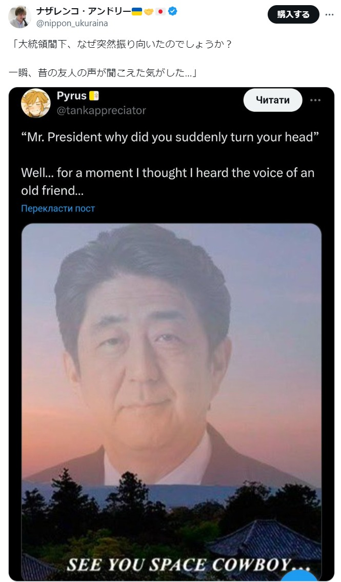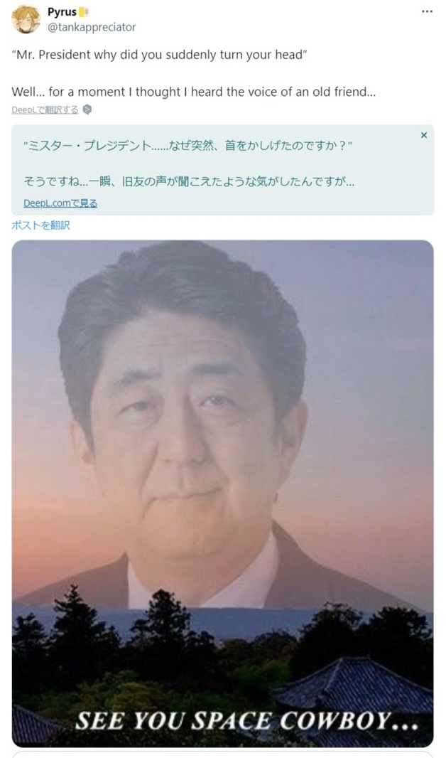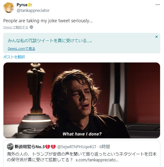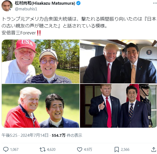 【悲報】「トランプが助かったのは、安倍の声が聞こえたから」というデマ、爆速で広がる Twitter Facebook はてブ LINE コピー 2024.07.15 スポンサーリンク ◇ 1: 名無しさん 2024/07/15(月) 12:54:57.941 ID:2iKU2nrct アメリカ人、「トランプが助かったのはシンゾーの声が聞こえたからw」というネタツイをする↓日本の右翼、信じ始めて大拡散 ◇ 2: 名無しさん 2024/07/15(月) 12:55:13.800 ID:2iKU2nrct ↓ネタツイをしたアメリカ人、困惑 ◇ 7: 名無しさん 2024/07/15(月) 12:56:25.597 ID:v4aBmB4WS >>2かわいそう 続きを読む