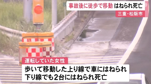 三重県松阪市の伊勢自動車道で7月14日の夜、乗用車で単独事故を起こした女性が車道を歩いて移動し、車3台にはねられ死亡しました。