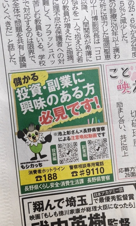【画像】警察の広告 投資詐欺みたいな広告になるwwwwwwwwwww Twitter Facebook はてブ LINE コピー 2024.07.16 スポンサーリンク 1:それでも動く名無し 警備員[Lv.2][新芽]:2024/07/15(月) 23:44:56.35 ID:gdMQrEf50 2:それでも動く名無し 警備員[Lv.3]:2024/07/15(月) 23:46:04.60 ID:AMxwyP6g0 草 続きを読む