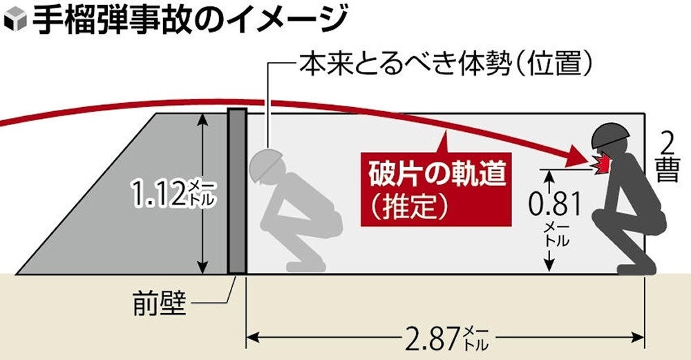 報告書によると、2曹は防護壁の前壁から約2・8メートル後方で、頭を壁よりも低くしてしゃがんでいた。破片の一部は放物線の軌道で飛び散り、前壁を越えて、地面から約80センチの位置にあった2曹の首に当たった。