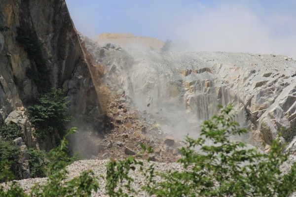 岩に深く穴を掘り、火薬・ヒューズ・砂を入れて、鉄の棒で突き固めるという作業です。