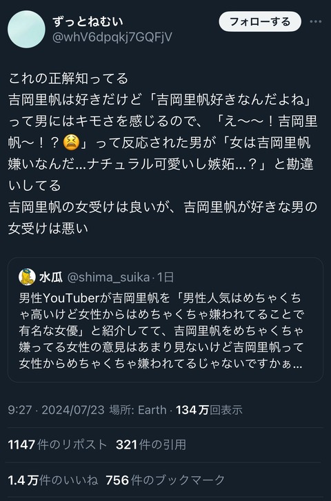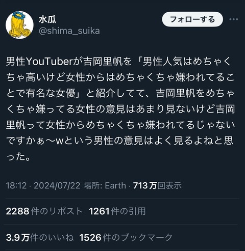 違うの!違うの!吉岡里帆を好きな男が嫌いなだけなの!