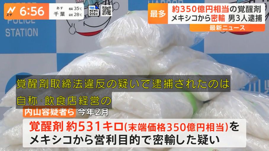 覚醒剤531キロ密輸容疑 過去6番目の押収量 末端価格350億円