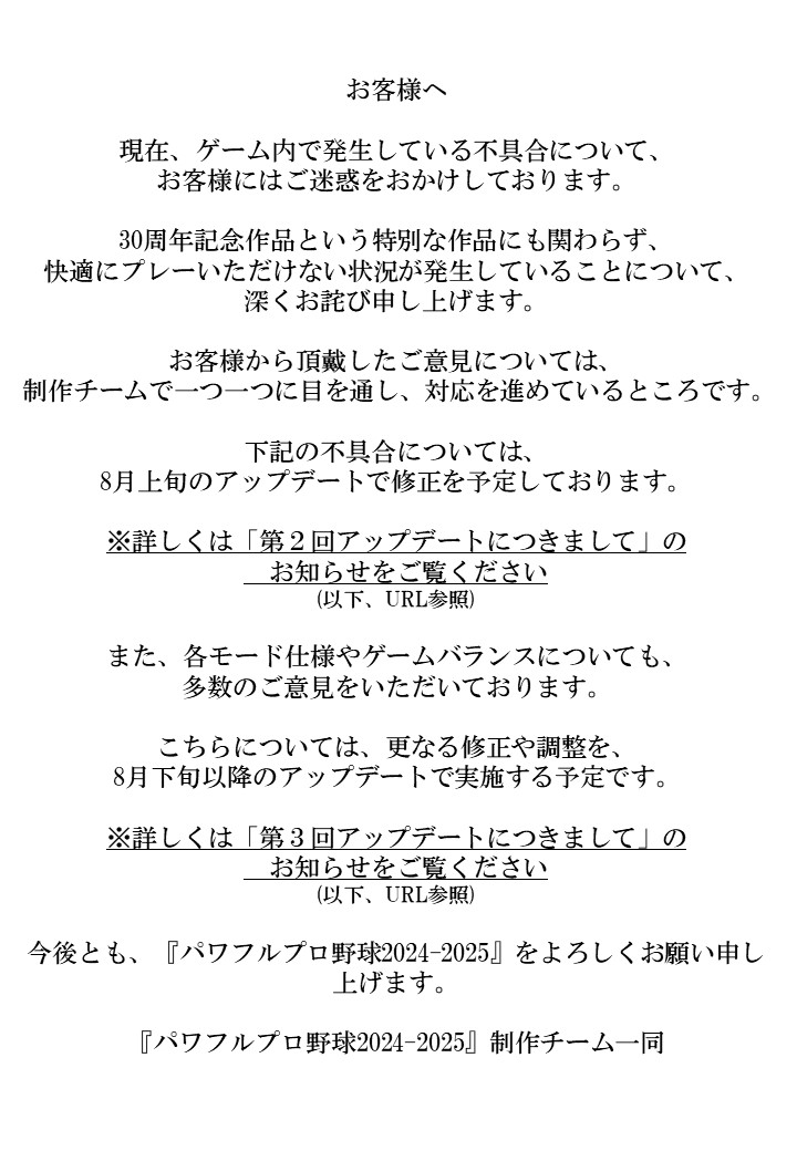 パワプロ公式、パワプロ2024がバグまみれで謝罪 Twitter Facebook はてブ LINE コピー 2024.07.26 スポンサーリンク ◇ 1: 名無しさん 2024/07/25(木) 19:10:22.578 ID:A7VPCa/G/ ◇ 4: 名無しさん 2024/07/25(木) 19:11:00.731 ID:GR19m4YSO 申し訳ないでやんす ◇ 7: 名無しさん 2024/07/25(木) 19:11:30.747 ID:CmtA/Jmqe 意味のないお詫びだよ 続きを読む