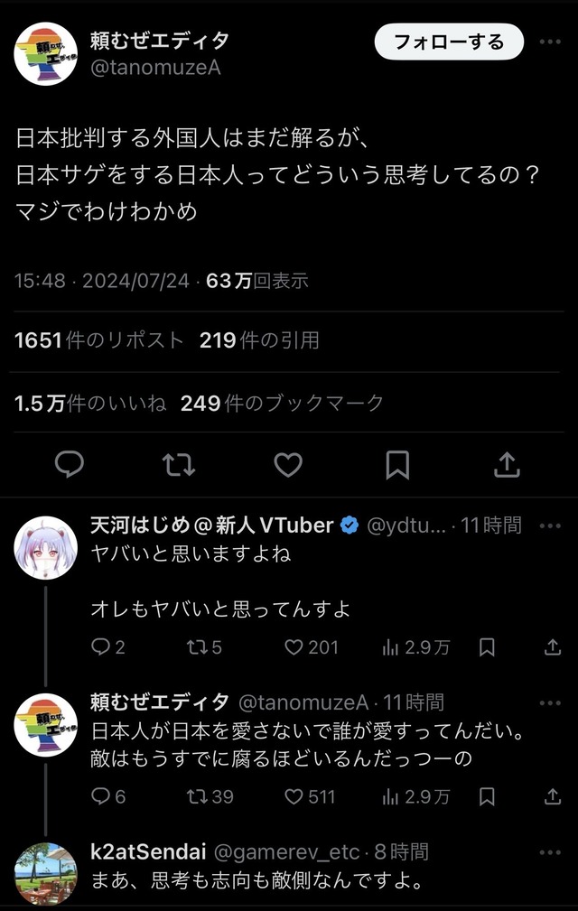 日本人「日本批判する外国人はわかるけど、日本下げしてる日本人ってどんな思考してんの?」 Twitter Facebook はてブ LINE コピー 2024.07.26 スポンサーリンク 1: それでも動く名無し 警備員[Lv.8][新芽] 2024/07/26(金) 07:52:51.94 ID:wEg+laI40FOX ほんまこれ トビウオ、最大400m飛べてしまう・・・ 続きを読む