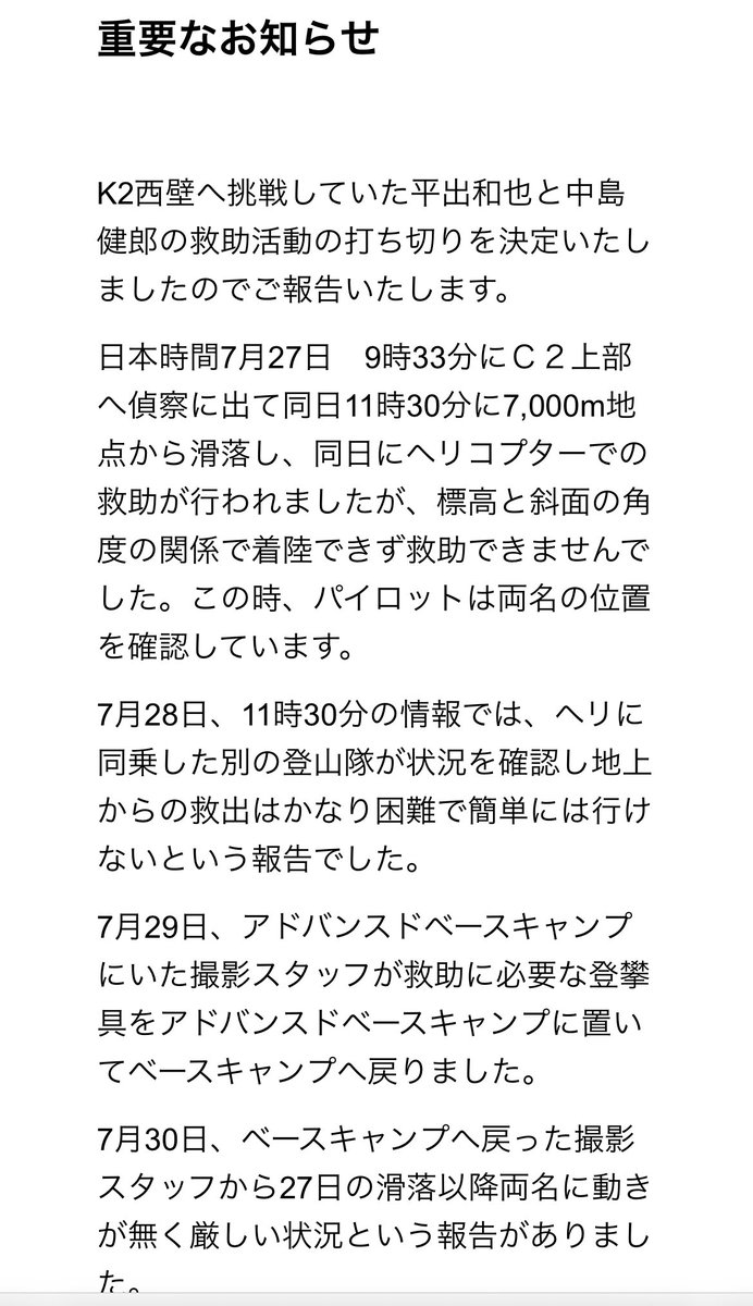 パキスタンにある世界第2の高峰K2(8611メートル)で滑落した、いずれも山岳カメラマンでクライマーの平出和也さん(45)=長野県出身=と中島健郎さん(39)=奈良県出身=について、2人が所属する登山用品販売の石井スポーツは30日、救助活動を打ち切ったとホームページ上で発表した。