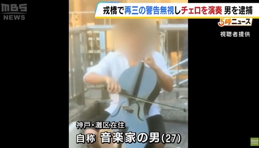 逮捕容疑は7月24日午後7時35分ごろ~50分ごろ、府警の許可を得ずに大阪市中央区の戎橋の上でチェロを演奏し、多数の人を集めて交通に影響を及ぼした疑い。