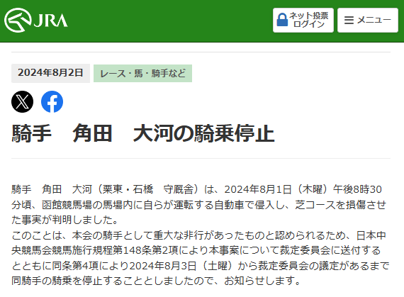 このことは、本会の騎手として重大な非行があったものと認められるため、日本中央競馬会競馬施行規程第148条第2項により本事案について裁定委員会に送付するとともに同条第4項により2024年8月3日(土曜)から裁定委員会の議定があるまで同騎手の騎乗を停止することとしましたので、お知らせします。