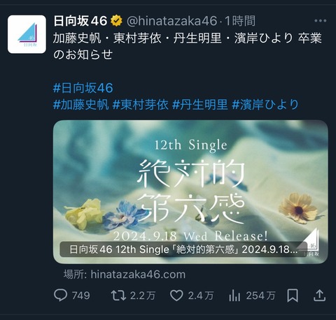 【悲報】日向坂46さん、一挙に4人卒業wwwwwwwwwwwwww Twitter Facebook はてブ LINE コピー 2024.08.06 スポンサーリンク 1:それでも動く名無し 警備員[Lv.17]:2024/08/06(火) 19:10:30.73 ID:9OlLCbij0 7:それでも動く名無し 警備員[Lv.3][新芽警]:2024/08/06(火) 19:13:42.71 ID:p+Iok3mV0 かとしと丹生ちゃん卒業か 続きを読む