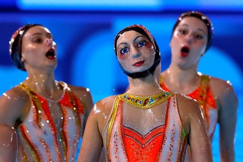【写真】「恐怖で絶叫」「趣味悪いよ」とネット戦慄…アーティスティックスイミングのフランス代表が着用していた“顔面帽子”