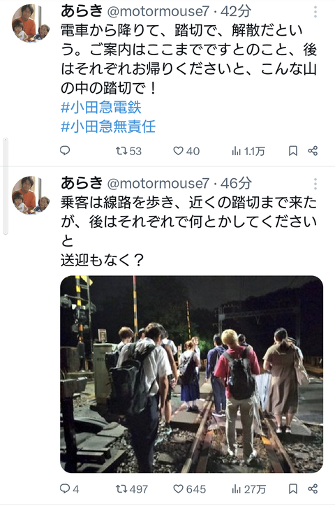 【画像】小田急線、地震で何もない山中に突然降ろされその後は各自行動wwwwwwwww Twitter Facebook はてブ LINE コピー 2024.08.10 スポンサーリンク 1:以下、?ちゃんねるからVIPがお送りします:2024/08/10(土) 16:05:02.770 ID:TDiY7Nx00 渋沢駅まで3キロくらいの場所 2:以下、?ちゃんねるからVIPがお送りします:2024/08/10(土) 16:05:39.133 ID:7U3YO95rr 国交省に怒られろ 3:以下、?ちゃんねるからVIPがお送りします:2024/08/10(土) 16:05:54.738 何で?地震? 4: 警備員[Lv.6]:2024/08/10(土) 16:05:59.336 ID:b0Bo1UmQ0 神奈川は都会だから甘えるな 続きを読む