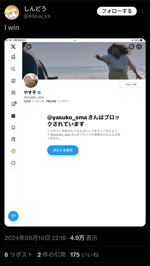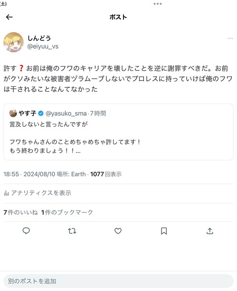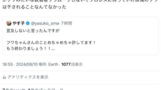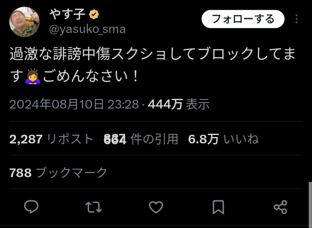 やす子、過激な誹謗中傷に法的措置を検討か Twitter Facebook はてブ LINE コピー 2024.08.11 スポンサーリンク 1:名無しさん@涙目です。(茸) [AU]:2024/08/11(日) 01:04:14.39 ID:50pbVTnm0 BE:271912485-2BP(1500) ソース https://aababab.com ↓ ↓ ↓ 2:名無しさん@涙目です。(神奈川県) [AU]:2024/08/11(日) 01:05:39.63 ID:nh/IBFmo0 いいね絶対許すな 続きを読む