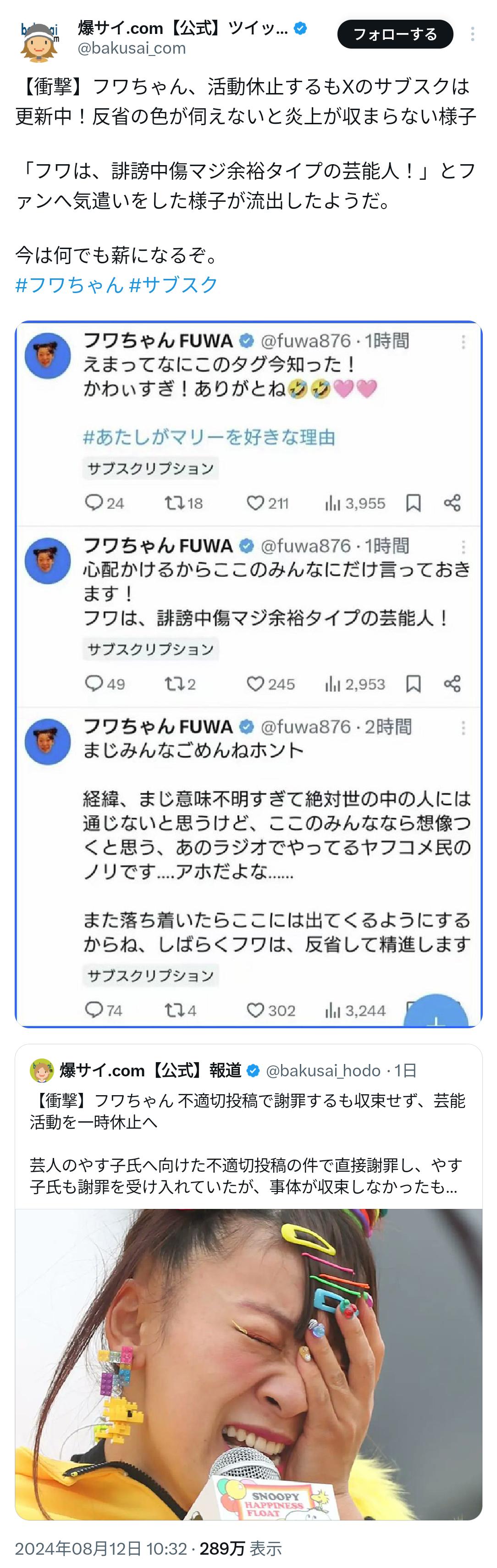 【衝撃】フワちゃん、活動休止するもXのサブスクは更新中!反省の色が伺えないと炎上が収まらない様子