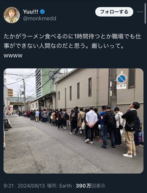 【画像】「たかがラーメン食べるのに1時間待つとか職場でも仕事ができない人間なのだと思う」←大炎上wwwwwwwwwww