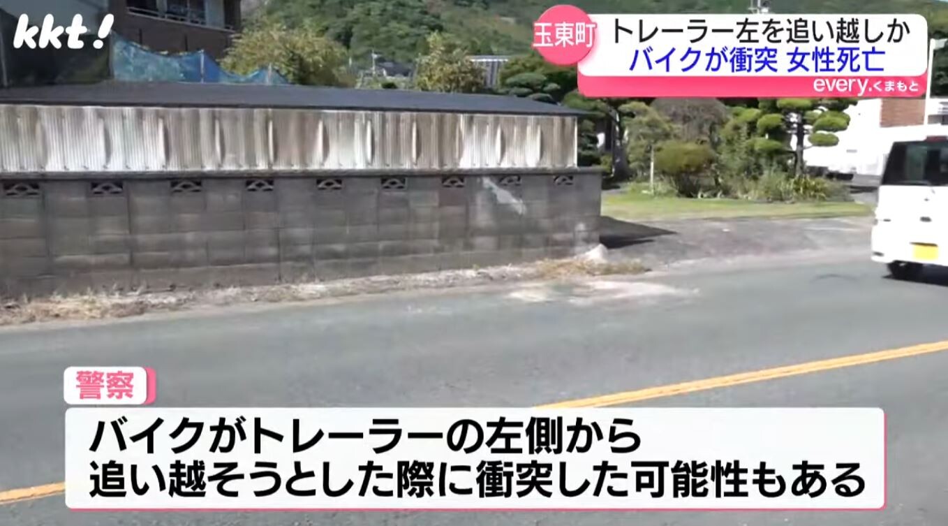 26日昼、玉東町でバイクとトレーラーが衝突する事故があり、バイクを運転していた25歳の女性が死亡しました。