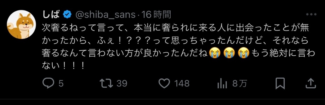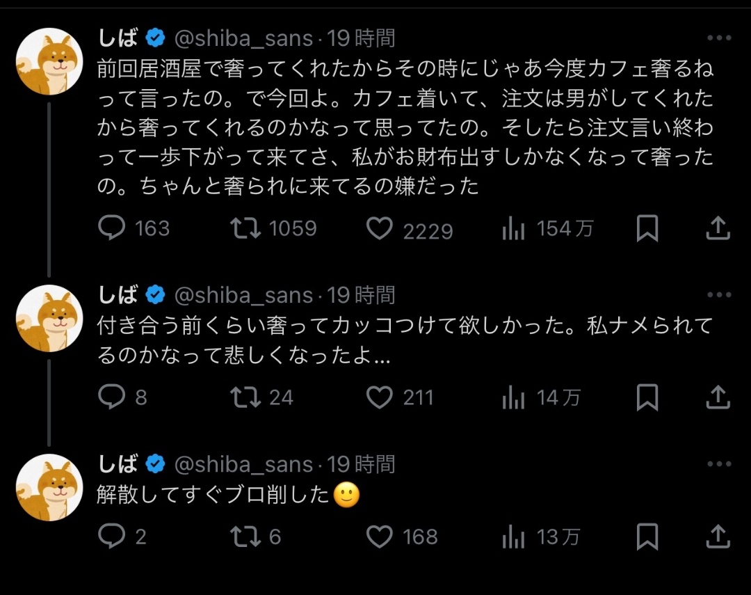 婚活まんさん「男が居酒屋奢ってくれたから次は私がカフェ奢るねって言ったら本当に奢らされたw」 Twitter Facebook はてブ LINE コピー 2024.08.27 スポンサーリンク 1:それでも動く名無し 警備員[Lv.11]:2024/08/26(月) 19:58:27.42 ID:IuXvWVo70 2:それでも動く名無し 警備員[Lv.11]:2024/08/26(月) 19:58:49.93 ID:IuXvWVo70 5:それでも動く名無し 警備員[Lv.9]:2024/08/26(月) 20:00:17.05 ID:LVOmDDS90 じゃあお前毎回奢るねっていってんの 8:それでも動く名無し 警備員[Lv.6][新芽]:2024/08/26(月) 20:01:26.55 ID:MtuVvQA80 こういう人を試すような態度かつ晒し者にする女って 続きを読む