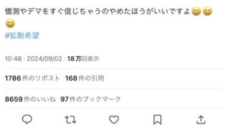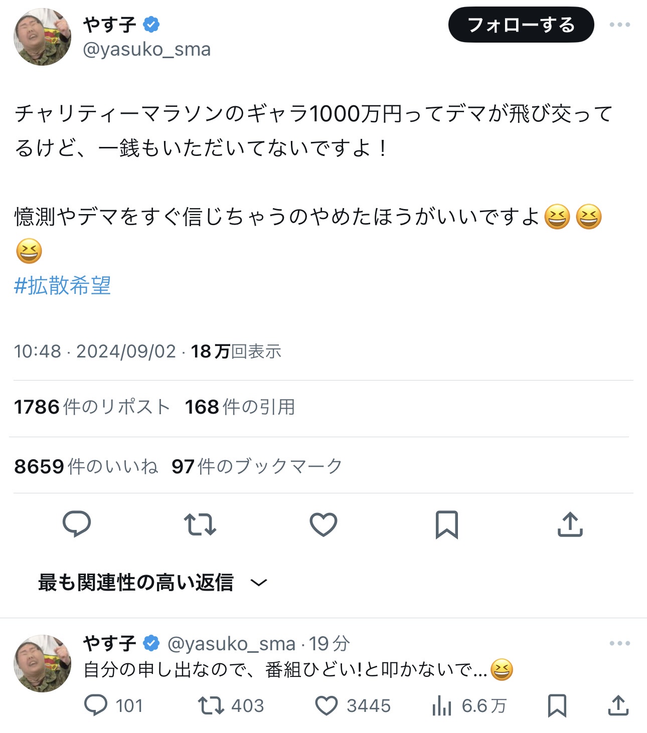 やす子、24時間マラソンはノーギャラだった Twitter Facebook はてブ LINE コピー 2024.09.02 スポンサーリンク ◇ 1: 名無し 2024/09/02(月) 15:34:08.52 ID:Cn4enWQX0 https://x.com/yasuko_sma/status/1830422596351095271 ◇ 4: 名無し 2024/09/02(月) 15:35:46.76 ID:Ga1GMk550 他の人はノーギャラではないと読み取れる ◇ 12: 名無し 2024/09/02(月) 15:37:50.67 ID:sc8QD4iY0 まあ言えるわけ無いからな 続きを読む