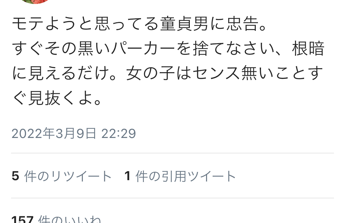 【速報】女「モテない男よ、パーカーを着るな」 Twitter Facebook はてブ LINE コピー 2022.03.10 スポンサーリンク 1:風吹けば名無し:2022/03/10(木) 19:28:41.90 ID:rGjdbakN0.net モテようと思ってる童貞男に忠告。 すぐその黒いパーカーを捨てなさい、根暗に見えるだけ。女の子はセンス無いことすぐ見抜くよ。 3:風吹けば名無し:2022/03/10(木) 19:28:56.30 ID:hKIrJ0xr0.net ワイやん 4:風吹けば名無し:2022/03/10(木) 19:29:05.27 ID:tG3zPJAL0.net 根暗やし 続きを読む