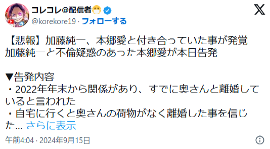 加藤純一不倫裁判の発言は全部嘘。本郷愛の告発、2022年末からすでに関係があった Twitter Facebook はてブ LINE コピー 2024.09.15 スポンサーリンク 1: 名無しさん@おーぷん 24/09/15(日) 06:25:49 ID:0AAp 虚言おじさんもう終わりやね これはアカン!!という画像貼っていけ 続きを読む