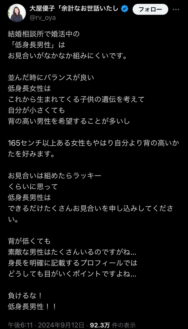 — 大屋優子「余計なお世話いたします」東京飯田橋のロックビレッジ婚活サロンの世話好き結婚カウンセラー (@rv_oya) September 12, 2024