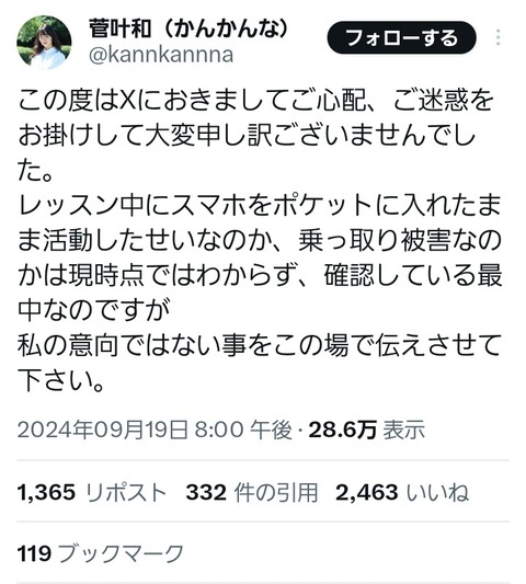 レッスン中にスマホをポケットに入れたまま活動したせいなのか、乗っ取り被害なのかは現時点ではわからず、確認している最中なのですが