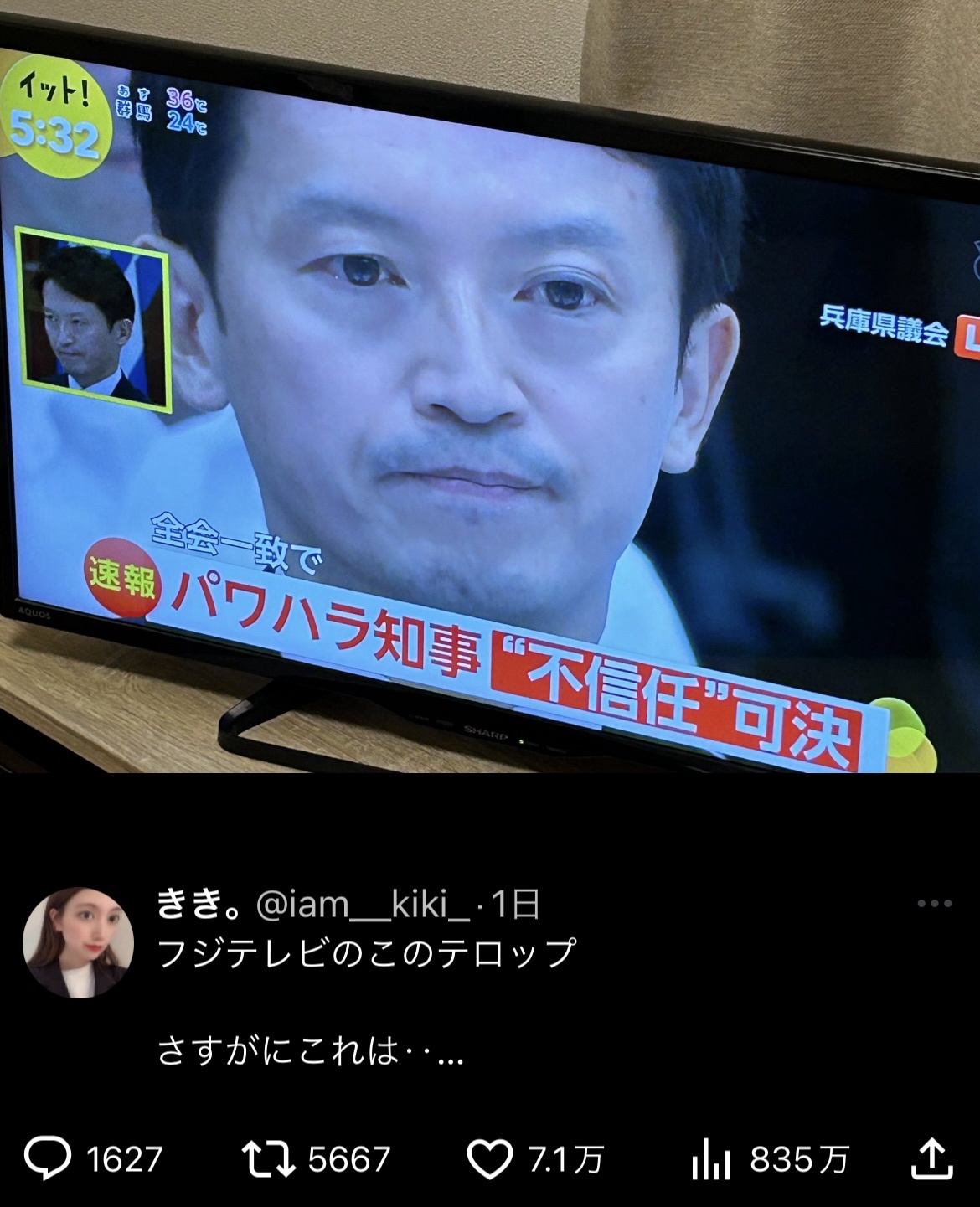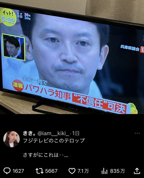 【画像】フジテレビ、斎藤知事を「パワハラ知事」呼ばわりしてしまい炎上wwwwwwwwwwwwwwwwwwwwwwwww Twitter Facebook はてブ LINE コピー 2024.09.21 スポンサーリンク 1:以下、?ちゃんねるからVIPがお送りします:2024/09/20(金) 23:27:30.209 ID:pwjrU3oH0.net あーあ 2:以下、?ちゃんねるからVIPがお送りします:2024/09/20(金) 23:27:55.704 ID:JxqHZi380.net パワハラ知事じゃなくてパワハラ・おねだり知事な 続きを読む
