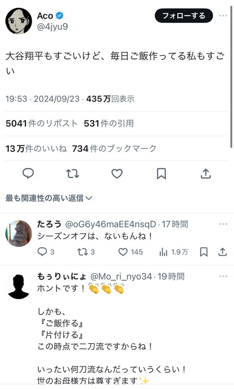 【悲報】女さん「大谷翔平が凄い?じゃあ私も毎日家事やってて凄い!」13万いいねwwwwwwwww Twitter Facebook はてブ LINE コピー 2024.09.25 スポンサーリンク 1:それでも動く名無し:2024/09/25(水) 14:42:07.42 ID:fWQUigkm0 どうして張り合おうとするんや・・・ 比べられるものじゃないやろ・・・ 2:それでも動く名無し:2024/09/25(水) 14:42:44.25 ID:Pej0Bj10r これもうやすこオリンピックやろ 3:それでも動く名無し:2024/09/25(水) 14:43:12.00 ID:o3KrnmsY0 お前らもよく関係ないスポーツ同士比べて自分以外の数字でカードバトルしてるやん? 続きを読む