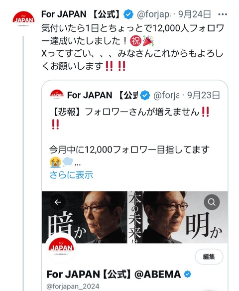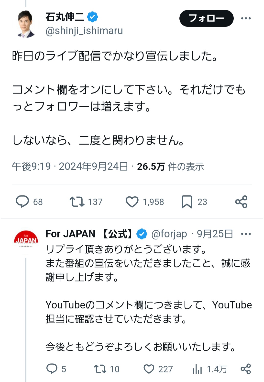 【悲報】石丸さん、リプライで本当に突然ブチギレるwwwwwwwwwwww Twitter Facebook はてブ LINE コピー 2024.09.27 スポンサーリンク 1:それでも動く名無し:2024/09/26(木) 23:57:24.26 ID:E6KUYCSO0 2:それでも動く名無し:2024/09/26(木) 23:58:42.17 ID:SqkgS4RN0 ぼくちゃんのおかげにならなきゃやーやーなの🥺 3: 警備員[Lv.4][新芽]:2024/09/26(木) 23:58:42.99 ID:feSvAK6D0 何でX上で言う必要があるの 続きを読む