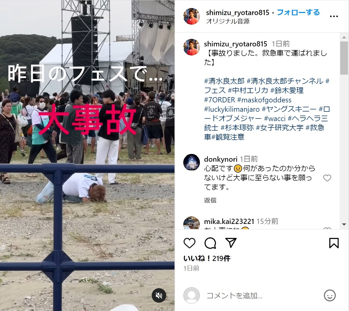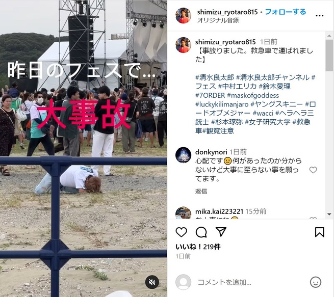 茨城県の大洗サンビーチで9月28日に開催された「OARAI HANABI FES」にメインMCとして出演していた清水さんは、「事故りました。救急車で運ばれました」とコメントを添えて動画を投稿。映像冒頭から地面にうずくまり微動だにしない清水さんが担架に乗せられ救急搬送されていく内容で、動画では「昨日のフェスで……大事故 救急車で運ばれました。今も全く動けません……」と文字で報告。「近日、事故動画がありますので公開します 観覧注意です」と呼び掛けました(投稿はその後削除)。