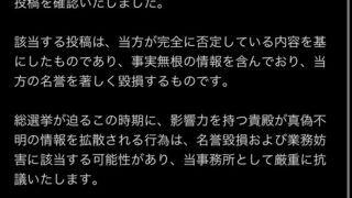 該当する投稿は、当方が完全に否定している内容を基にしたものであり、事実無根の情報を含んでおり、当方の名誉を著しく毀損するものです。… https://t.co/euLhrmUUJU
