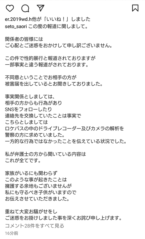 ジャングルポケット斎藤の嫁、お気持ち表明 「相手の方からも行為があった」 Twitter Facebook はてブ LINE コピー 2024.10.07 スポンサーリンク 1:それでも動く名無し 警備員[Lv.8][新]:2024/10/07(月) 11:27:11.12 ID:UlHCVc7q0 https://www.instagram.com/p/DAzju0xzXAu/?hl=ja 3:それでも動く名無し 警備員[Lv.8][新]:2024/10/07(月) 11:27:39.92 ID:UlHCVc7q0 強姦強姦って書いてた奴震えて眠れ 続きを読む