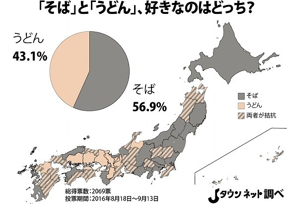 そこでJタウン研究所では、「そばとうどん、好きなのはどっち?」というテーマで都道府県別にアンケート調査を行った(総得票数2069票、