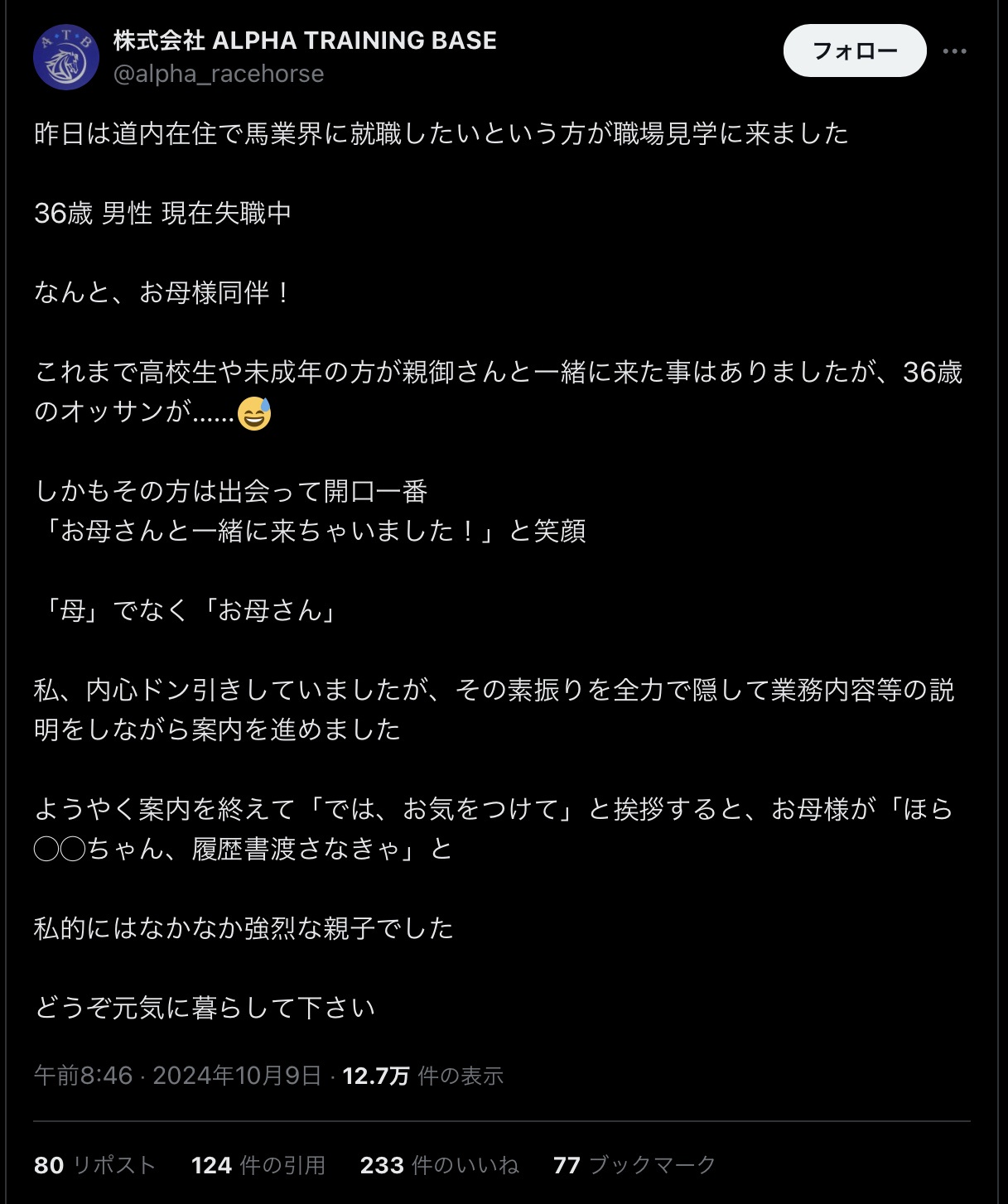 【悲報】競走馬育成牧場「36歳無職が母親同伴で職場見学に来たから晒したろ!」 Twitter Facebook はてブ LINE コピー 2024.10.09 スポンサーリンク ◇ 1: 名無し 2024/10/09(水) 12:32:20.47 ID:kqP9huhi0 https://x.com/alpha_racehorse/status/1843800253612601525 ◇ 3: 名無し 2024/10/09(水) 12:34:06.75 ID:eIJkXrEH0 こんなこと外に向けて発信しちゃうこいつも同じランクってのがわかってないのが微笑まC ◇ 12: 名無し 2024/10/09(水) 12:37:13.39 ID:DBqEdWtAd なぜそれをSNSで しかも会社名で発信してしまうのか 続きを読む