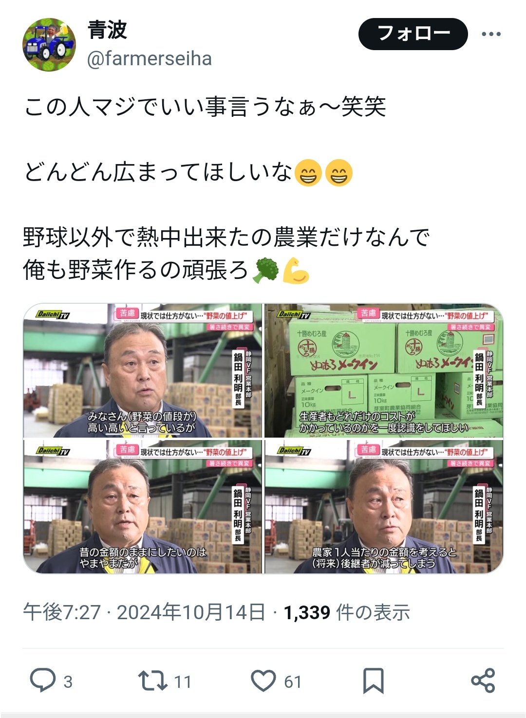 農家さん「野菜が高い?こっちだって人件費やコストがかかるんだよ」 Twitter Facebook はてブ LINE コピー 2024.10.14 スポンサーリンク ◇ 1: 名無し 2024/10/14(月) 21:42:22.28 ID:1/SwNPf/0 ◇ 3: 名無し 2024/10/14(月) 21:44:17.83 ID:G8XmFGfQ0 そらそうよ ◇ 5: 名無し 2024/10/14(月) 21:47:44.26 ID:Zg9O1NeT0 給与に対して文句いうべきよな 続きを読む