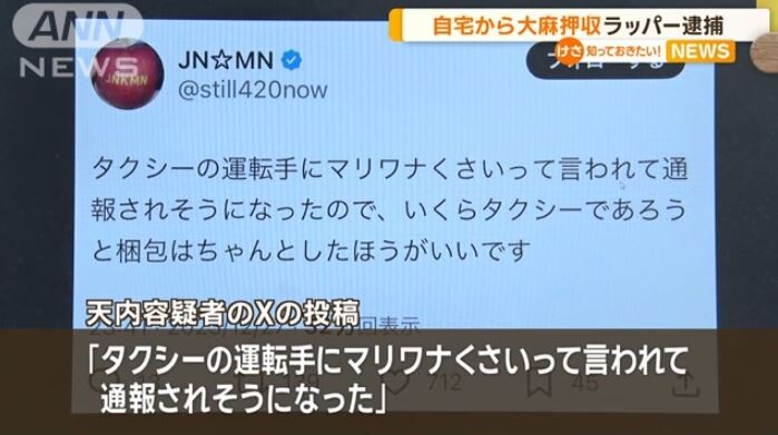 逮捕前にこのように投稿していた天内容疑者。「大麻を持っている人がトラブルに遭わないように注意喚起しただけ」などと容疑を否認しています。
