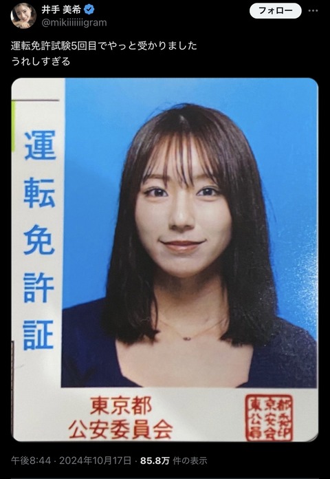 【画像】アイドルさん、運転免許取得wwwwwwwww