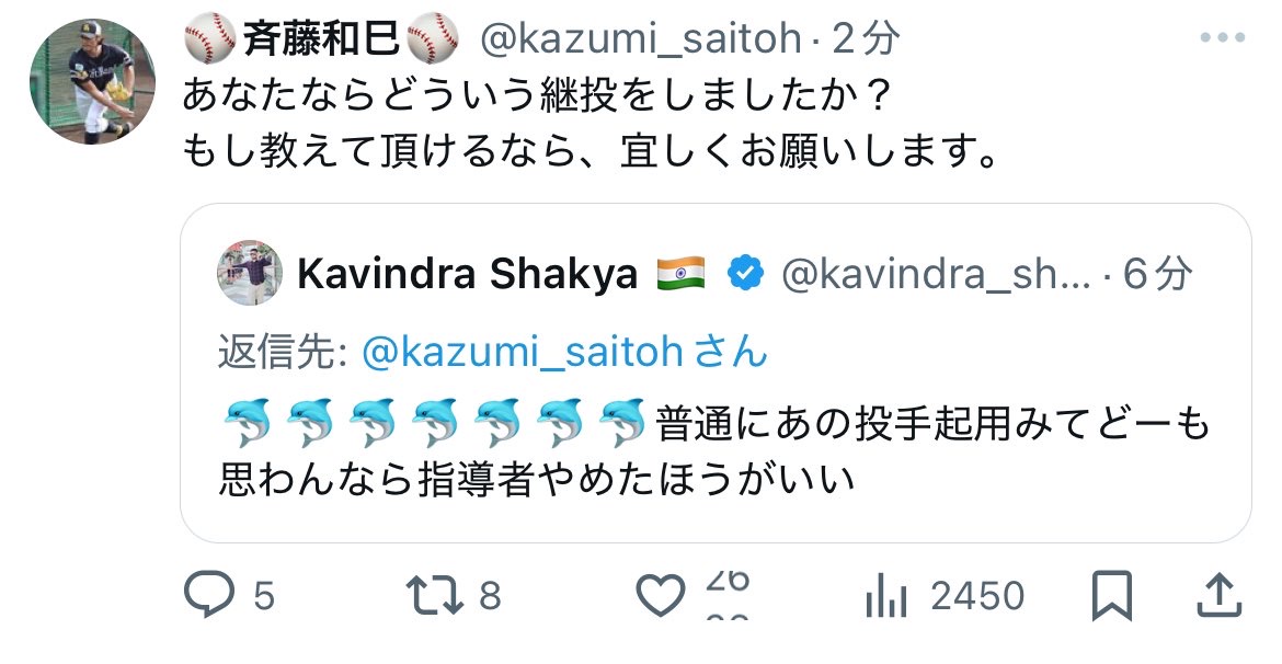 【悲報】SB斉藤和巳4軍監督、インプレゾンビとレスバ開始 Twitter Facebook はてブ LINE コピー 2024.11.04 スポンサーリンク ◇ 1: 名無し 2024/11/03(日) 23:36:30.51 ID:ffwpkShx0 えぇ・・・ ◇ 2: 名無し 2024/11/03(日) 23:37:05.52 ID:cR0WpQNw0 草 ◇ 3: 名無し 2024/11/03(日) 23:37:11.06 ID:jP4u2JVZ0 しかもほならね理論 続きを読む