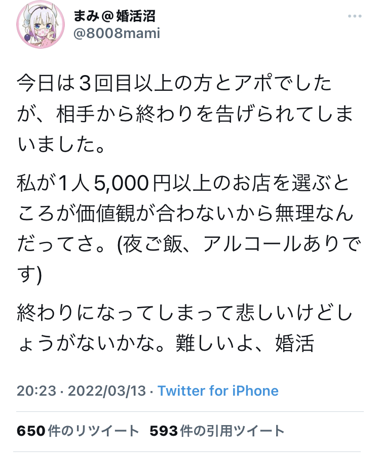 【悲報】婚活女子さん、毎回1人5000円以上の店を選び別れを告げられる… Twitter Facebook はてブ LINE コピー 2022.03.15 スポンサーリンク 1: 風吹けば名無し 2022/03/14(月) 22:13:32.70 ID:oy5rtdKE0 https://twitter.com/8008mami/status/1502968527585947652 10: 風吹けば名無し 2022/03/14(月) 22:15:37.17 ID:C2Z0InLu0 金があろうがなかろうが、価値観が合わないなら無理 11: 風吹けば名無し 2022/03/14(月) 22:15:37.23 ID:HCq6mUmL0 まあ、そういうことなんやろな 続きを読む