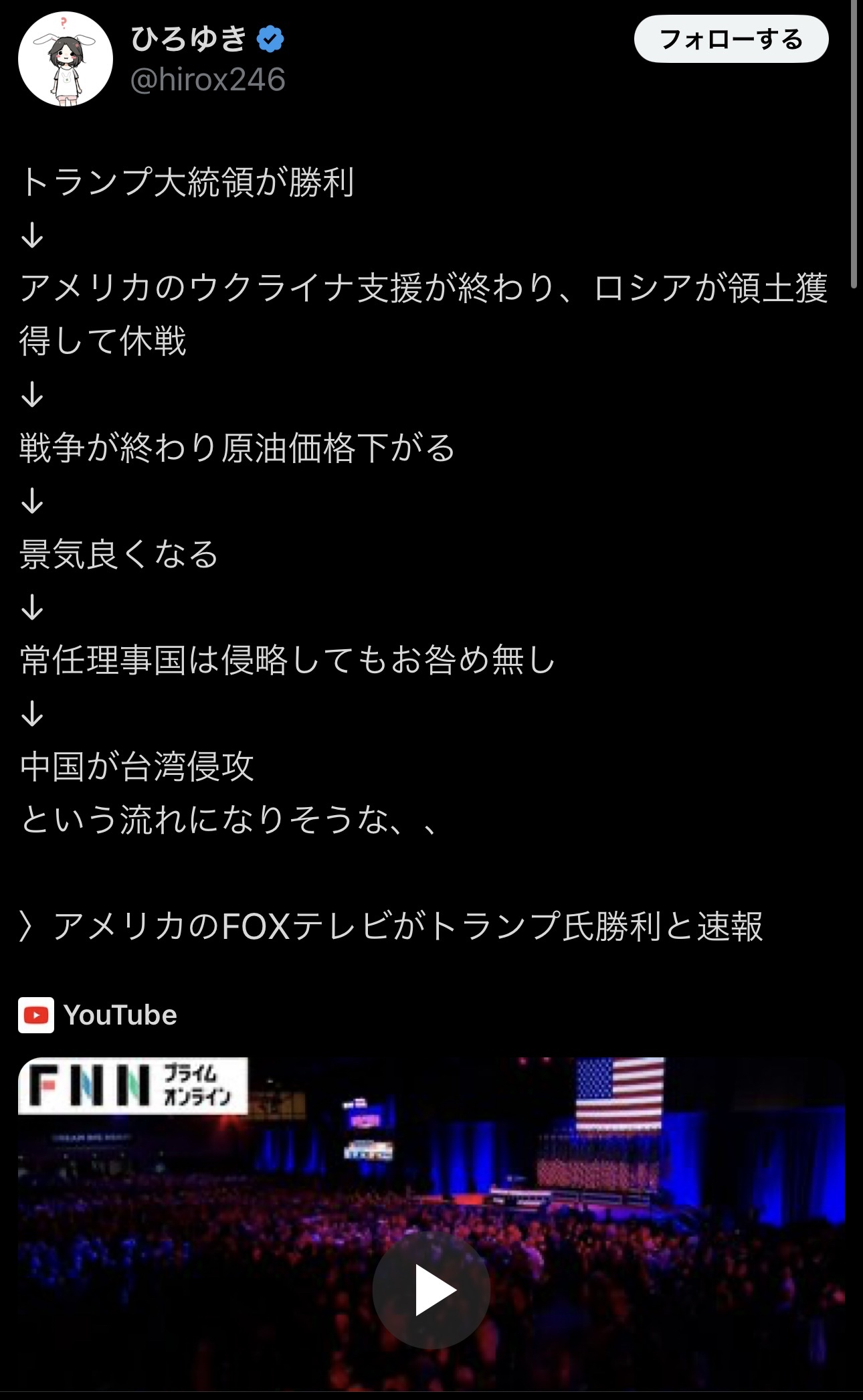 ひろゆき氏、トランプ当選で台湾有事が起きると予想。 Twitter Facebook はてブ LINE コピー 2024.11.06 スポンサーリンク 1:名無しさん@涙目です。(茸) [CN]:2024/11/06(水) 19:50:11.22 ID:AaCrOvGi0 BE:271912485-2BP(1500) ソース http://5ch.net 10:名無しさん@涙目です。(新日本) [EG]:2024/11/06(水) 19:52:55.82 ID:WQRkdKNl0 その続き 尖閣侵攻 ↓ 米軍は無視 ↓ 自民党「ぎゃおおおん」 続きを読む