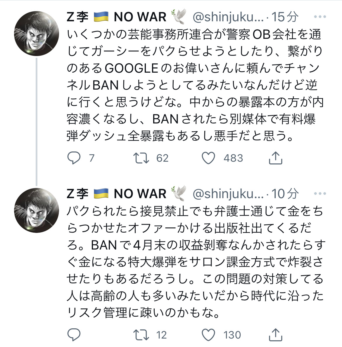 【速報】芸能事務所、ついに連合を組んでガーシー潰しに動き出す Twitter Facebook はてブ LINE コピー 2022.03.15 スポンサーリンク 1:風吹けば名無し:2022/03/15(火) 10:12:41.96 ID:KRchAunea.net どうなるガーシー 3:風吹けば名無し:2022/03/15(火) 10:14:01.44 ID:y8Ahm5Av0.net 口止め料払ったらいいの( 4:風吹けば名無し:2022/03/15(火) 10:14:13.81 ID:wDaZdd0Q0.net そもそもなんでこいつが広報やってんの 11:風吹けば名無し:2022/03/15(火) 10:15:40.59 ID:2UihPk4Fa.net >>4 ガーシーの詐欺被害者にお金を返させるため 続きを読む